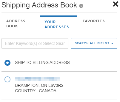 - FAVORITES: Display any favorite addresses and select one as the shipping address, if applicable.