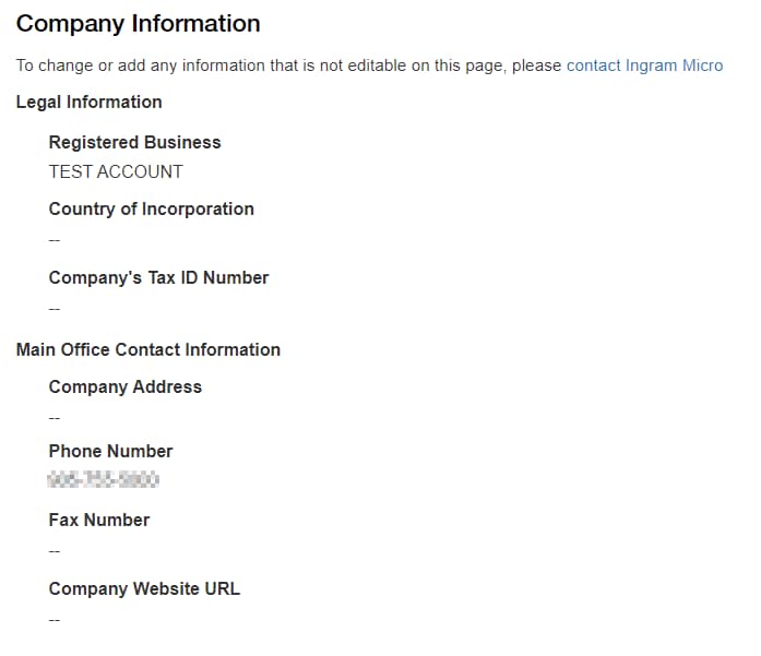 Your account with Ingram Micro includes your company legal details and office location(s). Account Administrators, or user(s) with viewing rights, can view this information at any time. Editing these fields are restricted. Please contact us to make changes to this information.